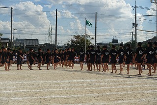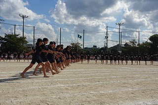 最初は歩幅を一人ひとりが変えて横一列で行進するのに苦労しましたが,本番きれいに並んで行進できました。