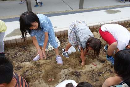 つるをひっぱるとすぐに切れてしまうので,まわりの土を少しずつどかして掘っていきます。