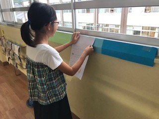 友達の班との交流に向けて,つくったポスターを廊下に掲示しています。
