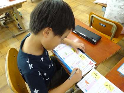 1年生は今週から漢字の学習が始まりました。子どもたちはとても張り切って学習に取り組んでいます!今日勉強した「四」は少し難しかったようですが,お手本を見ながら一生懸命丁寧に練習していました!