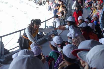始まるまでの間,ショーをしてくださるお兄さんやお姉さんとハイタッチ!