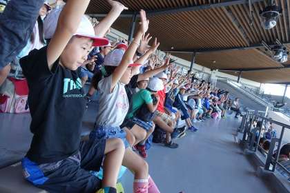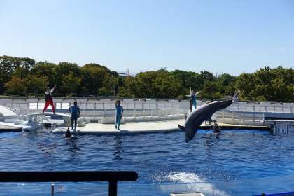上手に技が決まったら,みんなで両手を挙げて,すごいね!と,ありがとう!の気持ちをイルカに伝えました。