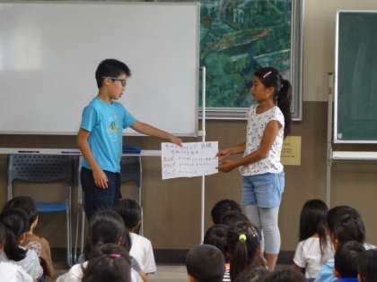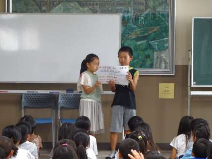 今月の学年集会では,学習発表会に向けてのチャレンジ目標を発表しました。「見ている人に感動や笑顔を与えられる発表にするために」各クラスで目標を考えました。目標を意識しながら練習に励んでいってほしいと思います。