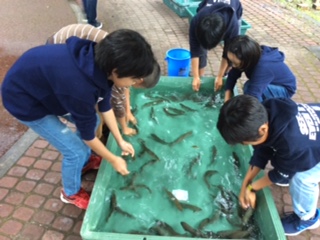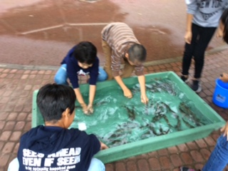 水槽に入った魚をつかみます。サッとつかみ子もいますが、なかなかつまめない子もいます。ヌルヌルしているそうです。でも、何度も挑戦しています。