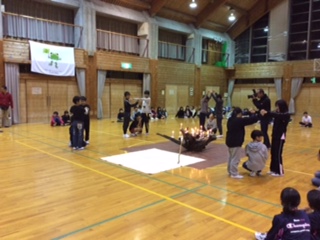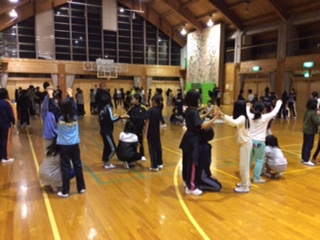 キャンドルを囲んでゲームを楽しんでいます。写真は、きこりとリスというゲームです。