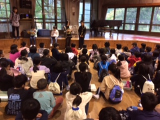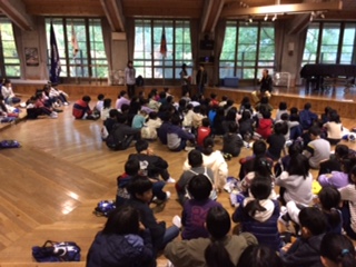 おはようございます。少し眠そうな顔もみえますが、二日目の朝の集いです。今日のめあては、自然と仲間です。