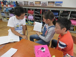 ノートに書かれた自分の考えを,班の友だちと交流しながら,考えを深めています。