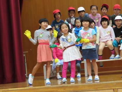 教室で練習したことを活かして,いろんな動き,ポーズをつけながらがんばっています。大きな声でせりふを言えるようになってきた子が,だんだん増えてきました。