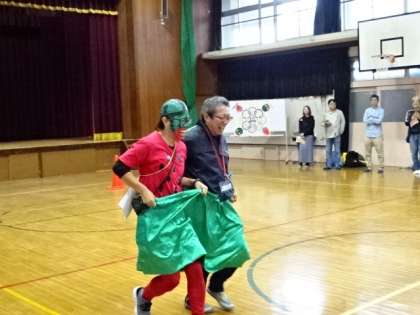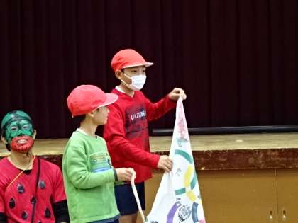 でかスカリレーのお手本は北上のアイドルスイカマンと校長先生です!とても嬉しそうです。バルーンはみんな大好き!来年は,大宮小学校でワイワイ運動会が開催されるのでしっかり北上の旗を受け取りました。鷹峯小学校のみなさん,ありがとうございました!あたたかい応援うれしかったです!
