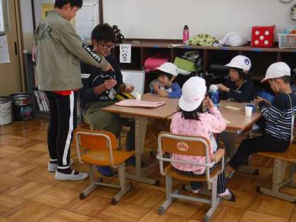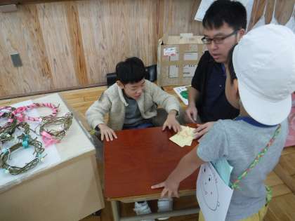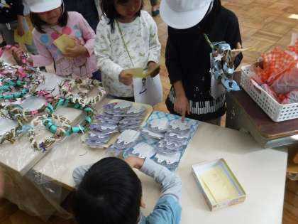 わなげコーナー・おかいものコーナー・おやつコーナー開店!イートインコーナーで食べることができます。おやつは,そらいろ畑で収穫したさつまいものいもごはんといも焼きです。「おいしい!」「うまい!」とぱくぱく食べる子どもたち。そらいろのお兄さんお姉さんもニコニコでした。