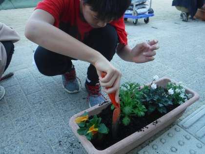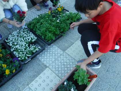 今日は,ミニシクラメン・パンジー・ビオラ・スノーボール・スイートアリッサムの苗を寄せ植えしました。植え方の説明をM先生から聞きました。最初,プランターの土を柔らかくして肥料の土と混ぜてそこに3つか4つ選んだ苗を置いて植えていきました。どれとどれが合うかな?考えながら植えていました。