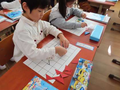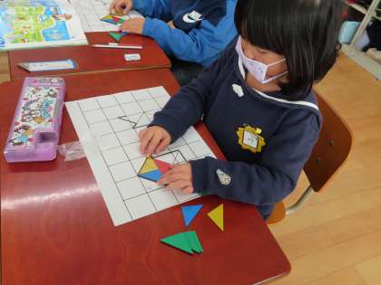 算数科で「かたちづくり」の学習をしています。色板を並べて,教科書にある,家・風車・ヨット・魚の形をつくりました。