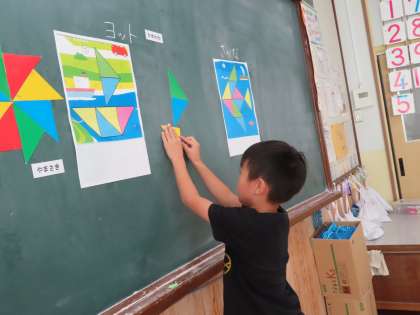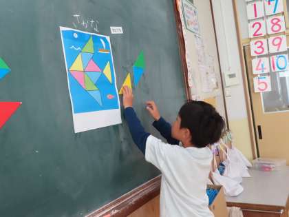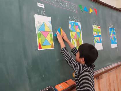 黒板には,大きいサイズの形を作りました。教科書の形をよーく見て,色板を並べることができましたね♪