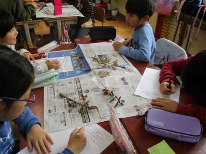 1学期からずっと育ててきた大豆が寿命になり,ついに枯れました…。今まで一生懸命お世話をし,観察してきたのでなんだかさみしい気持ちになりながらも,そっと抜いて最後に枯れた様子と根の観察をしました。緑色で葉がいっぱいついていたときと比べて変わったところや,土に隠れて見えていなかった部分についてじっくり調べることができました。大豆さん,今までありがとう!