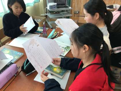 授業中に作った物語の魅力を書いた「お話のとびら」を読み合って交流しました。