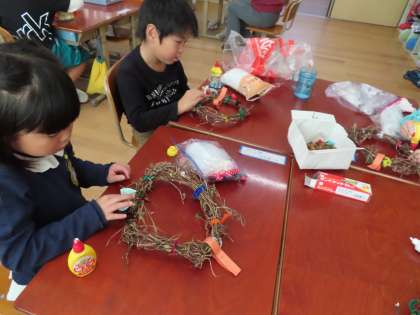 前に作ったリースの土台に,校外学習で拾ってきたドングリや,お家から持ってきた飾りなどを付けました。