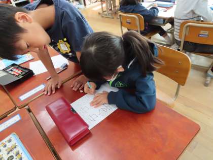 友だちがつくった作品を見て,「おぉ,すごい!」「どうやってつなげたらいいかな?」など,班の友だちといろいろ相談しながら活動していました。