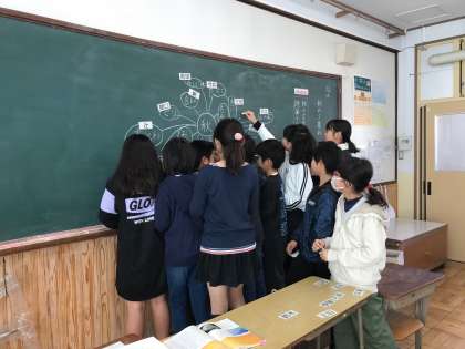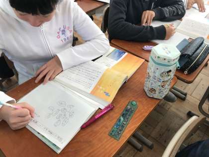 清少納言の「枕草子‐秋の夕暮れ‐」を読んでいる子どもたちです。