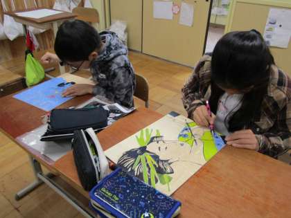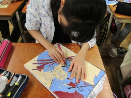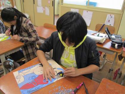 彫刻刀を使って,丁寧に彫っています。