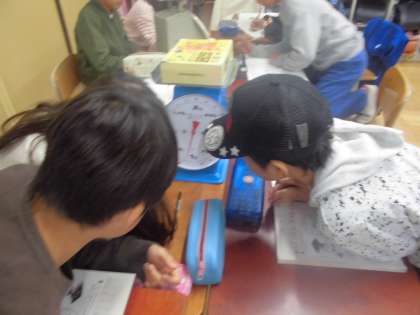 はかりの使い方を確認した後,いろいろな重さのものをはかりました。