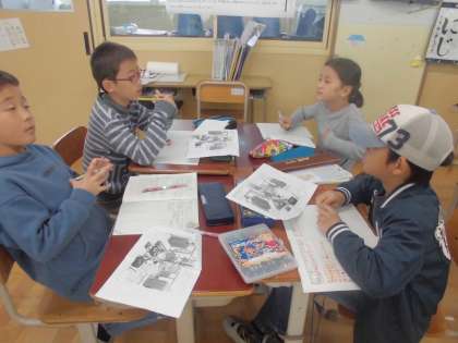 グループに分かれて,見つけたものを出し合いながら考えます。