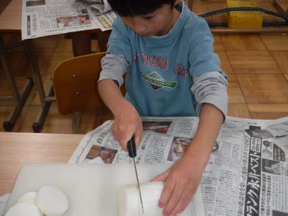 皮をむいてその後,輪切りにしました。だいたい1.5センチの幅に切りました。手際よく切っていました。