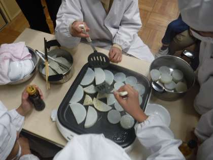 今日のメニューは「大こんステーキ」です。かくし包丁も入れて青首大根と聖護院大根と味比べをしました。青首大根は,水分が多く,聖護院大根の方は,水分が少ない感じでした。どちらもおいしく調理できました。