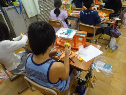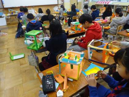 もともとついていた材料だけでなく,ストローや割り箸なども工夫して組み合わせていました。