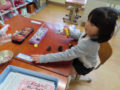 お家で集めて持って来てもらった松ぼっくりでツリーを作りました。どの飾りをつけようかといろいろ考えながら制作していました。