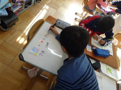 絵や関係図,線分図を使って考えることができました。友達に分かりやすく説明する姿や,真剣に友達の意見を聞く姿が見られました。