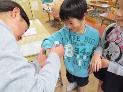 朝にスタンプを押してもらって,お昼ご飯の時に消えているか見てもらいました。みんなしっかり手を洗うことができていましたね。