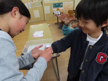保健委員会の子どもたちが,手の甲にスタンプを押して,しっかり手を洗うことができてきるかチェックする取組を進めてくれています。