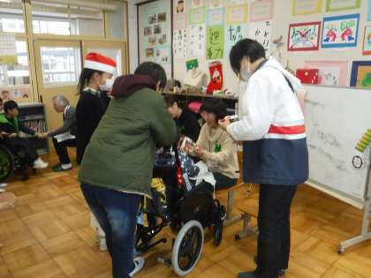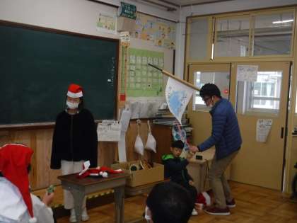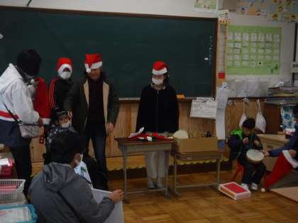 そらいろからは,「サンタはいまごろ」の歌とさつまいものつるで作ったリースをプレゼントしました。「あっ!さつまいものつるってめずらしいですね!柔らかいうちにまいたんですか?」ともこもこさんから。「毎月,ありがとうございます!」とみんなでお礼をいいました。