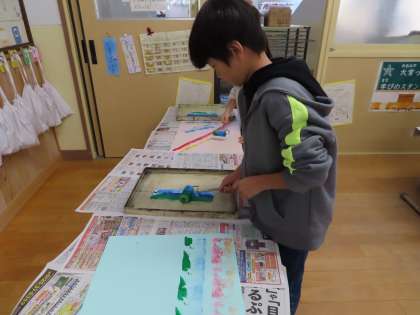 今回はローラーを使いました。3色,色を並べて,ビューっ!ローラーの作品と前回の作品を組み合わせて,作品を完成させます。どんな作品が出来上がるか…楽しみですね♪