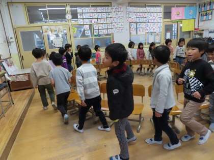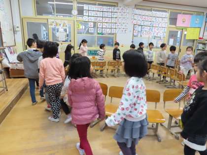 今日は雨降りだったので,教室で椅子取りゲームをしました。
