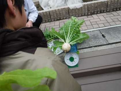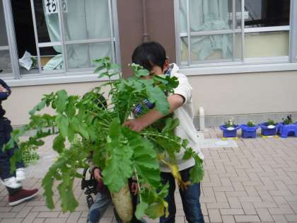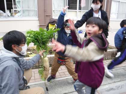 今日,そらいろの畑の大根をみんなで抜きました!聖護院大根と青首だいこんです。今年は,葉っぱもりっぱな大きい大根が収穫できました。中には自分の足と比べて「でっかい!」と大喜びの1・2年生。「家で大根ステーキにする!」と嬉しそうでした!
