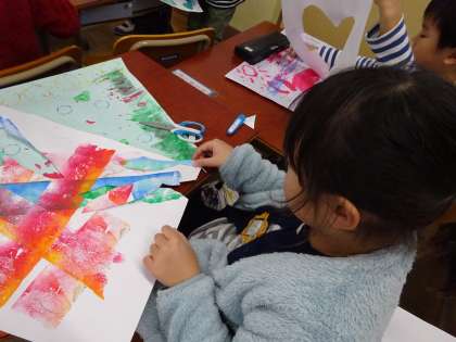 前回の授業では洗濯バサミや野菜に絵の具を付けてスタンプをしたり,ローラーに絵の具を付けてコロコロ模様を付けたりしました。今日は,スタンプしたものが何に見えるか想像したり,紙を生き物の形に切って画用紙に貼り付けたりしました。恐竜の世界や,海の中で魚が泳いでいるところなど,楽しい作品がたくさんできました。
