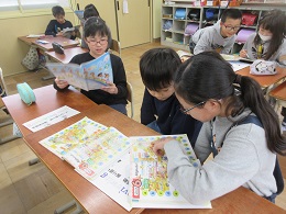 外国語活動の学習で,教科書に書かれているアルファベットを班ごとに探す学習をしました。