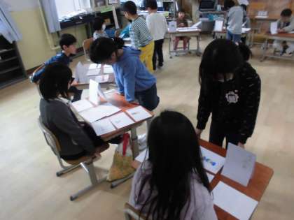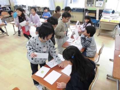国語の「ものの名まえ」の学習では,一つ一つの名前(りんご・バナナ)と,まとめてつけた名前(くだもの)を使って自分だけのお店を開きました。「おかしやさん」にはアメやガムが並び,「車やさん」にはいろいろな車種の車が並んでいました。子どもたちは『いらっしゃいませ!』『1つで500円になります。』など,店員とお客さんのやり取りにもこだわりながら楽しんでいました。