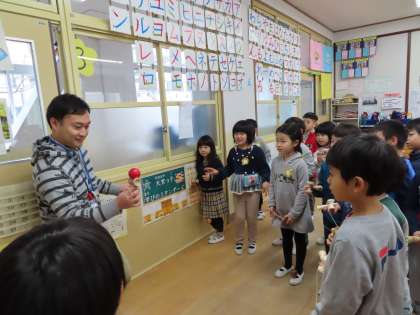 となりのクラスのN先生が,けん玉の技を見せに来てくれました。