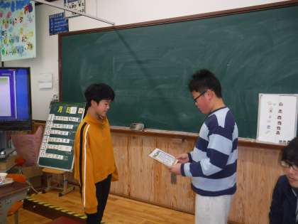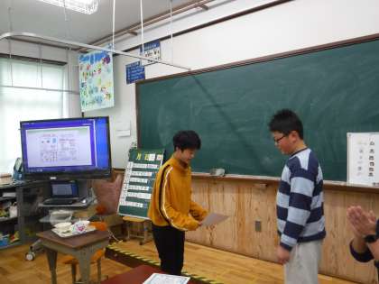 今日,給食時間に豆つまみ大会の「特別賞」の賞状を給食時間に給食委員会のお兄さんが持って来てくれました。