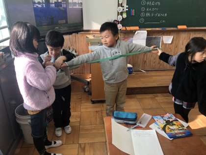 自分たちの両手を広げた長さはいったいどれくらいなんだろう・・・と紙テープを使って確かめました。