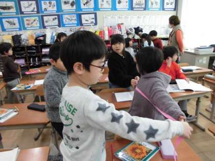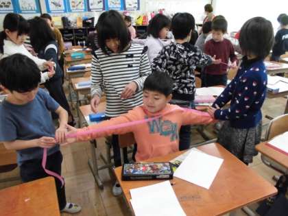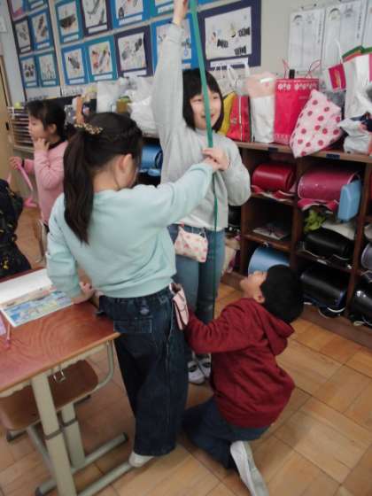 「〇〇さんの両手を広げた長さが120cmやったからそこから20cm切ったらいいかなあ。」と,昨日の学習をいかして活動していました。