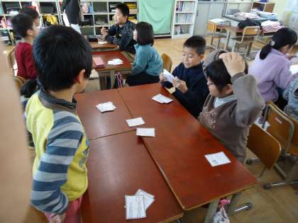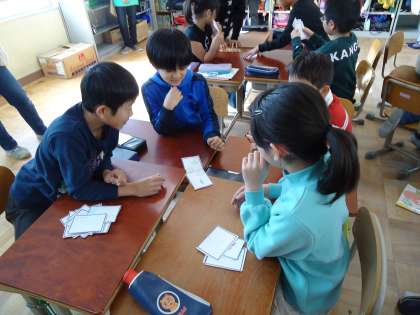 音訓かるた大会を行いました。「音訓かるた」とは「遠足で 遠くに行けて うれしいな」と五七五の中に音読みの「遠(えん)」と訓読みの「遠い」が存在する歌を作り,かるたにするというものです。いつものかるたと違ったことや自分でつくったものというのが楽しかったようです。音読みと訓読みを意識する学習となりました。