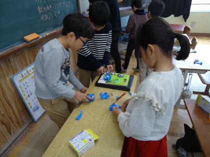 理科「豆電球にあかりをつけよう」の授業で実験キットをつくりました。どんなものが電気を通すのか教室中を調査です。電気を通すものであれば豆電球に明かりがつきます。子どもたちは夢中で行っていました。