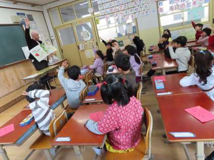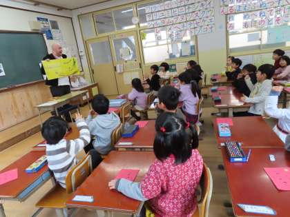 この日は,ライリー先生に読み聞かせをしてもらいました。ちょうちょが様々なものを食べて,どんどん色が変わっていく様子に盛り上がっていました。