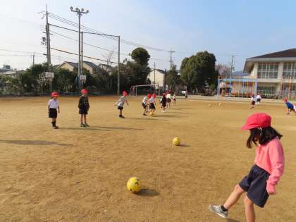 体育科で「ボールけりゲーム」の学習を始めました。まずは,相手にパスをつなぐ練習をしました。「○○さーん,いくよ〜!」「ナイス!!」と,子どもたちは上手くいかなくても,いつも通り楽しそうです。