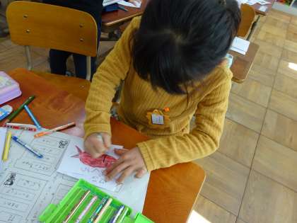 国語科の「ものの名まえ」の授業で,お店屋さんを開く準備をしました。看板を作ったり,品物カードを描いたりしました。「楽器」という言葉の中には「タンブリン」や「ピアノ」があること,「果物」という言葉の中には「りんご」や「バナナ」があることを学習できました。お店屋さんを開くのが楽しみですね。