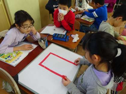 算数で新しい単元「変わり方」に入りました。棒を18本使って,どんな長方形ができるかを調べました。