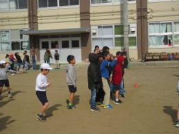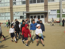 4年生の子たちは,キャッチしたボールを1年生に手渡したり,投げるコツを教えたりと,お兄さんやお姉さんになって一緒に遊んでいました。